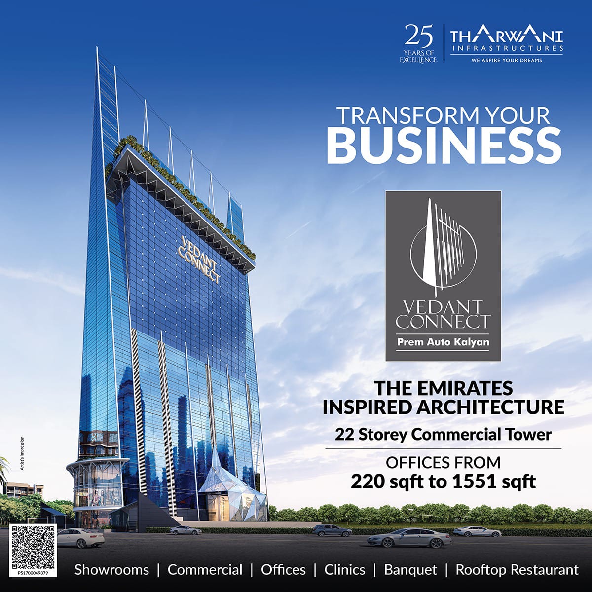 Tharwani Commercial Kalyan, also known as Vedant Connect, is a 23-storey premium commercial tower at Prem Auto Circle offering modern office spaces, retail shops, and lifestyle amenities.